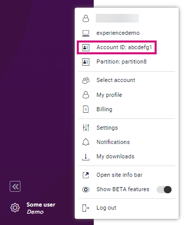 In order to call the API, you need your account ID from your Fresh Relevance account. To find this, expand the User menu and copy the Account ID value.
